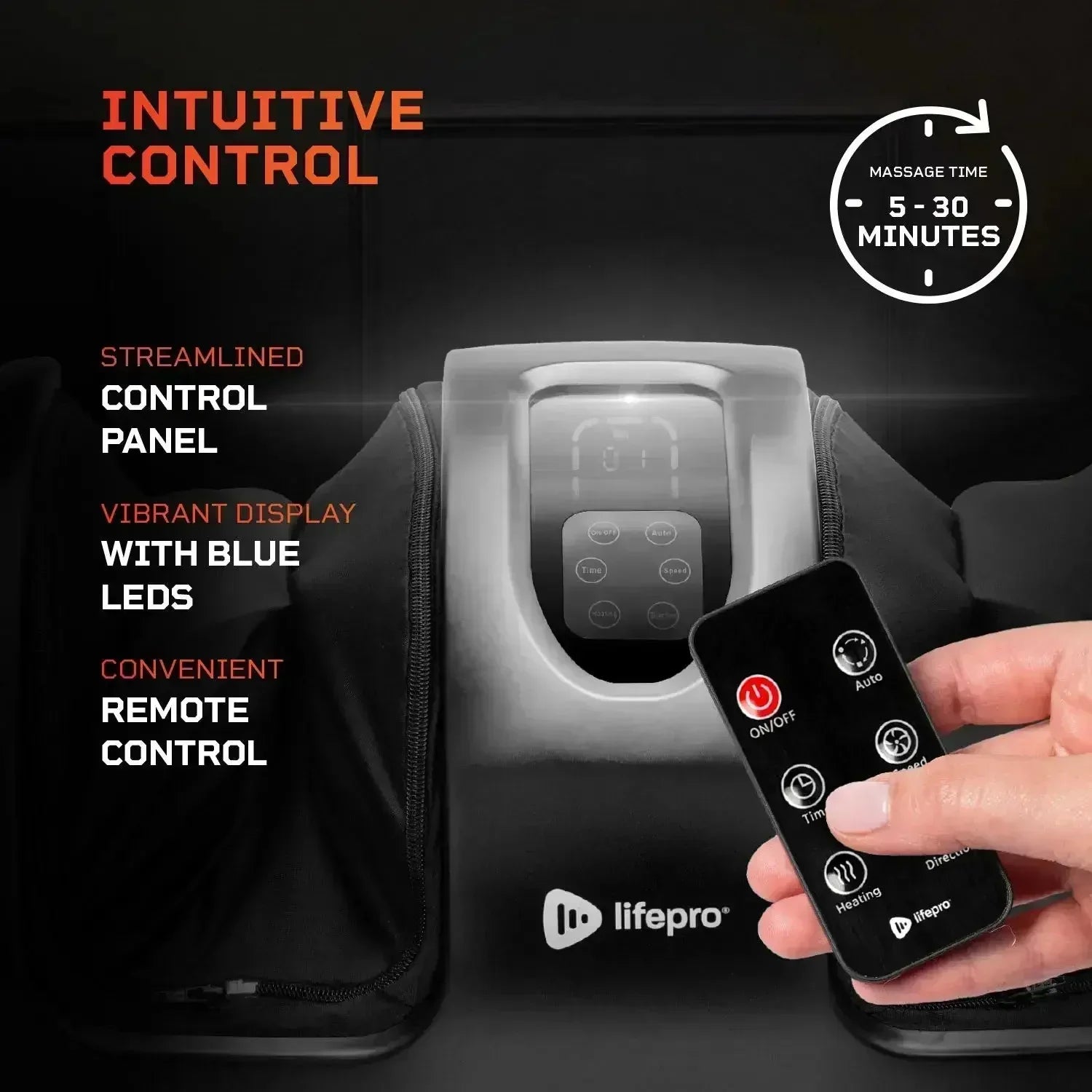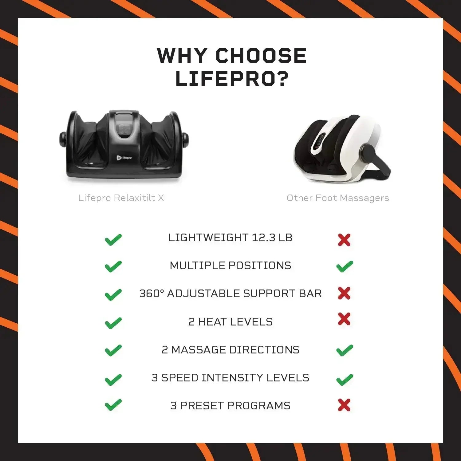 • Lifepro RelaxaTilt X Foot & Calf Massager — 3D roller and acupressure system; heat option; three auto programs and three speed levels for feet, calves, and forearms