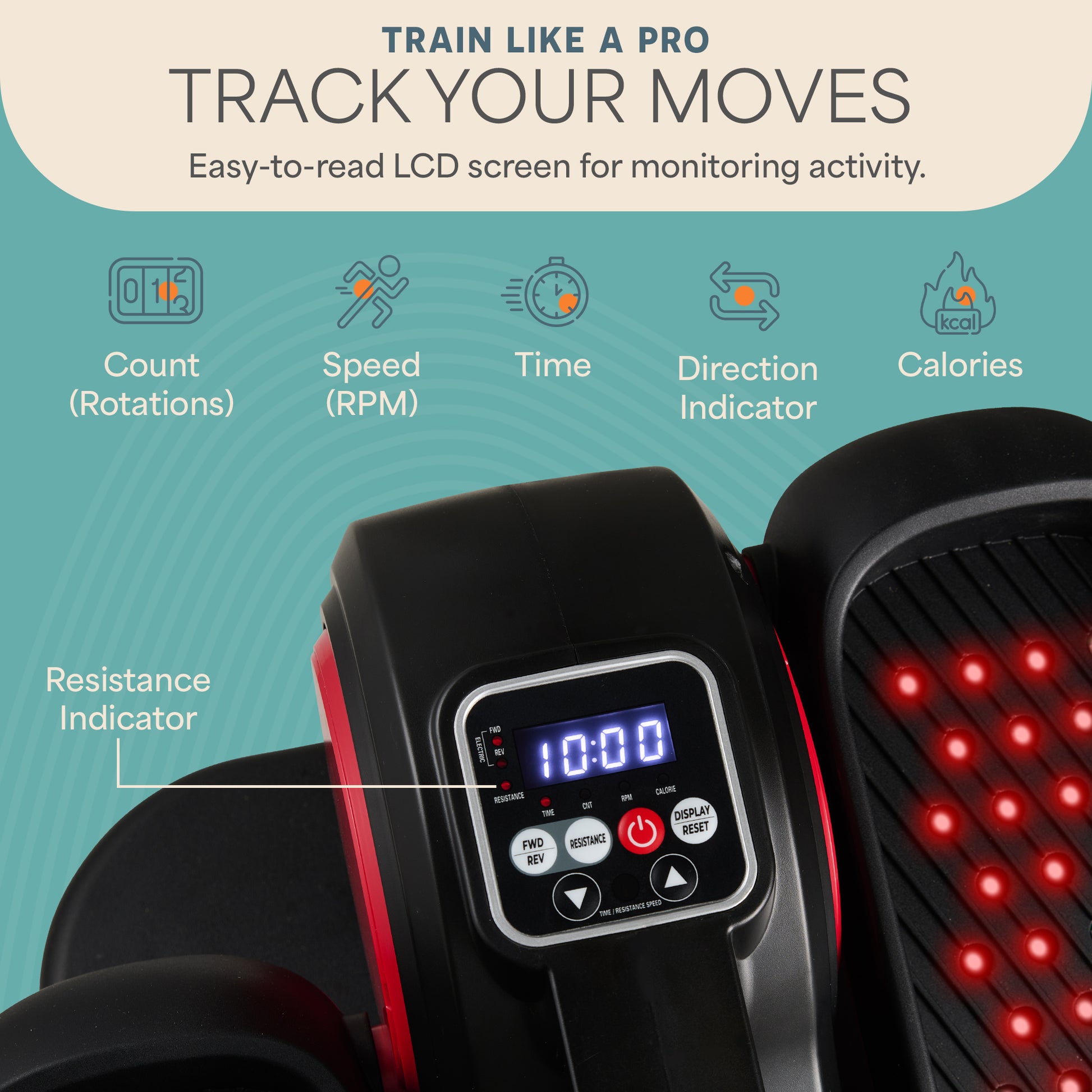 • Control Panel — Built-in buttons and LED display for monitoring time, speed, calories, and pedal direction