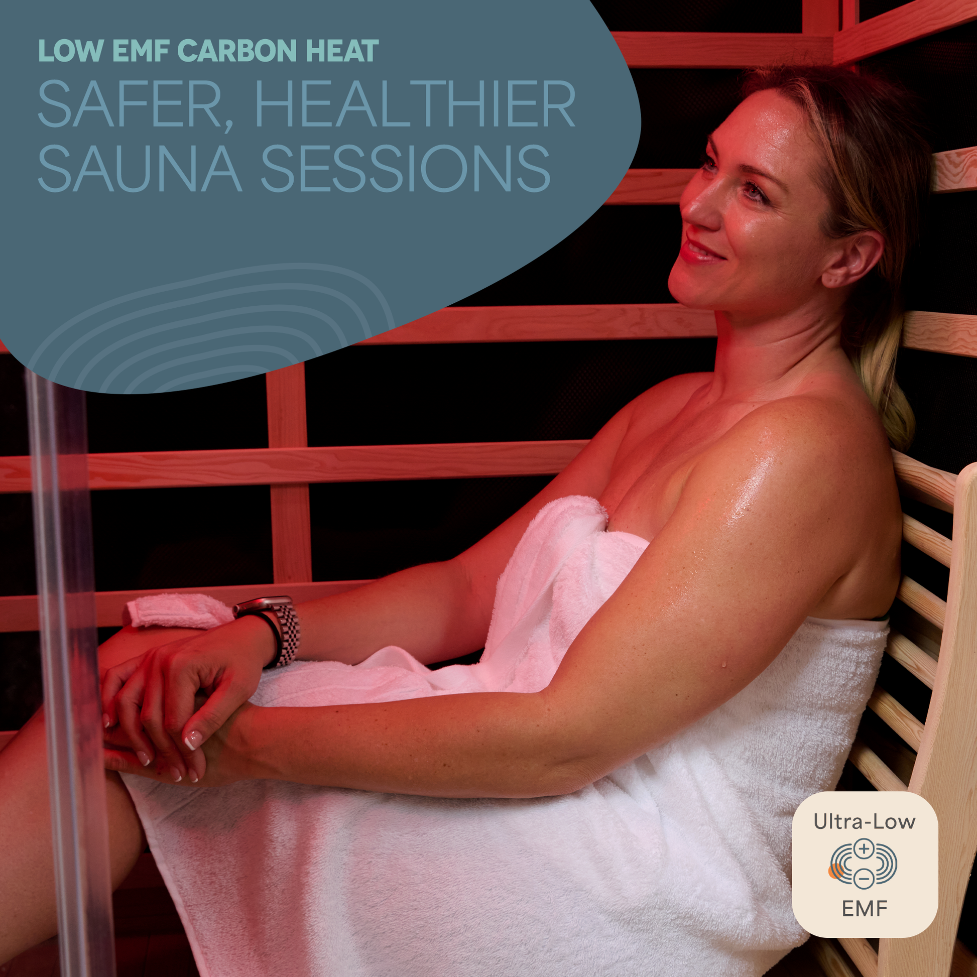 • Carbon-Fiber Heaters — Distribute even, far infrared warmth (5.6–15 microns) while maintaining ultra-low EMF (0.02 µT)