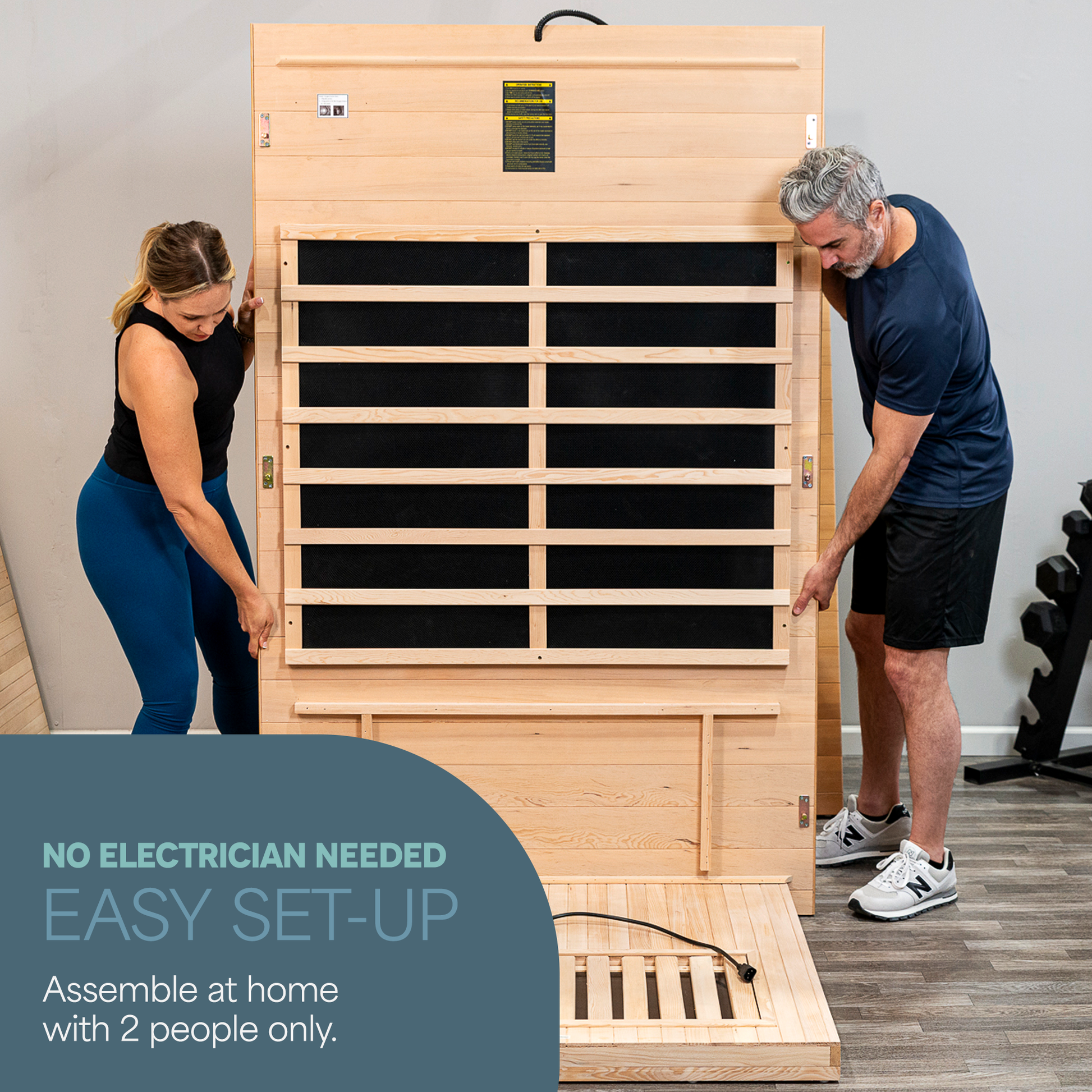 • Lifepro® RejuvaCure™ Low EMF Sauna — Available in single-person (35.4" × 35.4" × 74.8"; 229 lbs) or two-person Duet (47.2" × 41.3" × 74.8"; 276 lbs) models