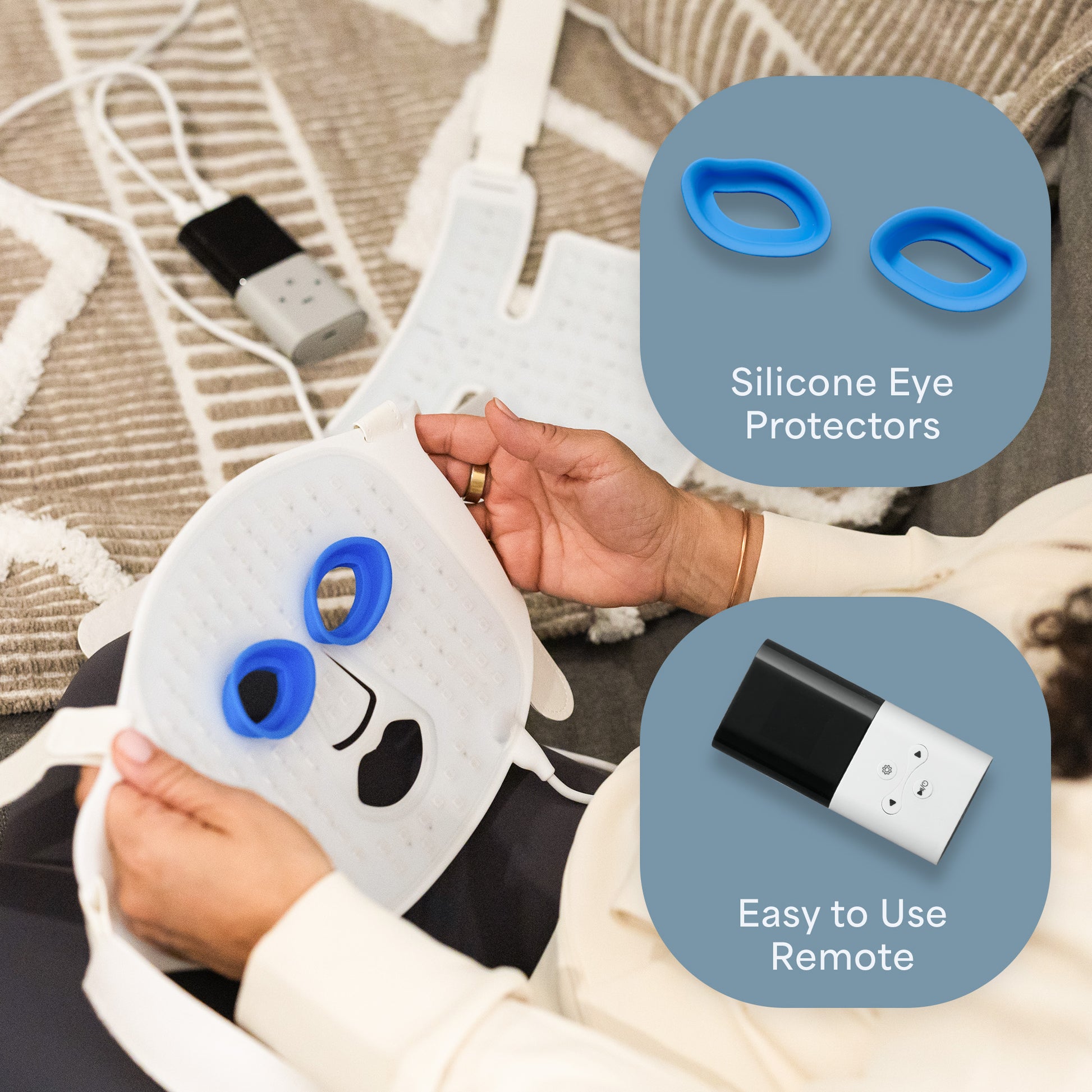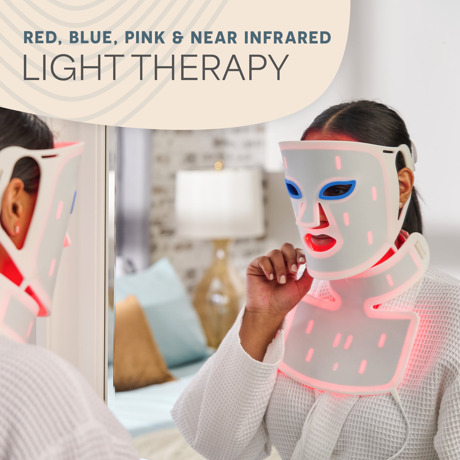 • RevitaGlow Pro Light Therapy System — Flexible face mask and separate neck and upper-chest mask with 234 LEDs (114 face, 120 neck) using Red (630nm), Blue (415nm), Near-Infrared (830nm), Pink (630nm + 415nm), and All light modes