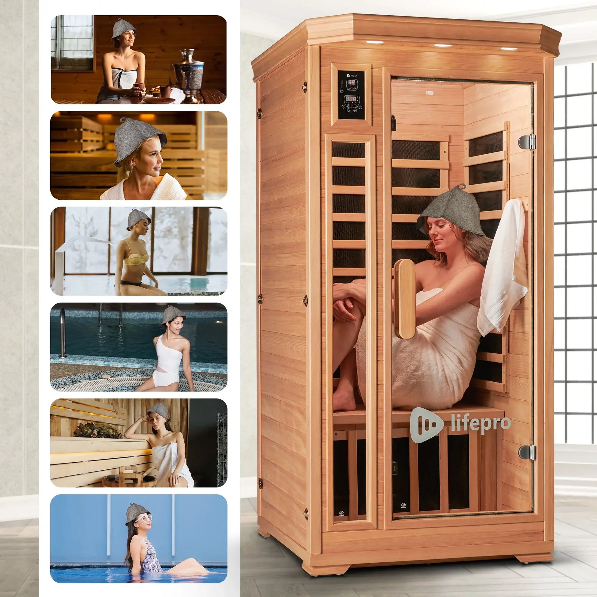 The LifePro Felt Wool Sauna Hat is crafted with premium natural wool to enhance your sauna experience. Designed to protect your head, hair, and skin from intense heat, this traditional Banya hat helps regulate temperature, allowing you to extend your sessions comfortably. Whether you’re enjoying a wood-fired sauna, infrared sauna, or steam room, this timeless accessory combines style, comfort, and functionality.
