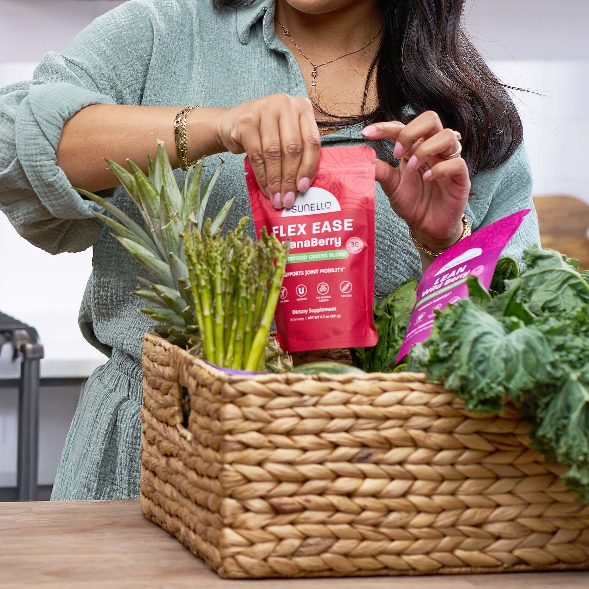 One pouch of Sunello superfood greens blend with a 30-day supply and a scoop for easy measuring.