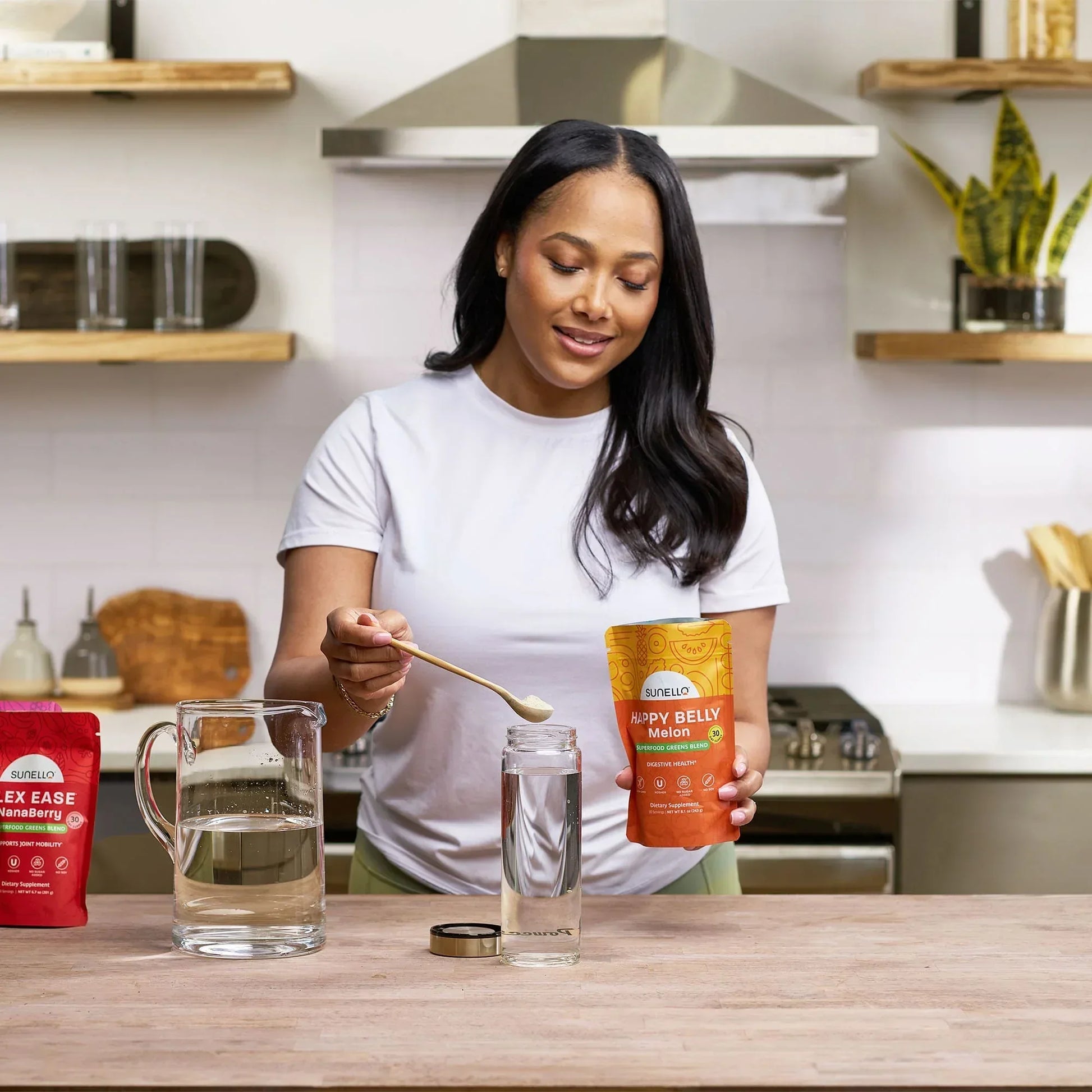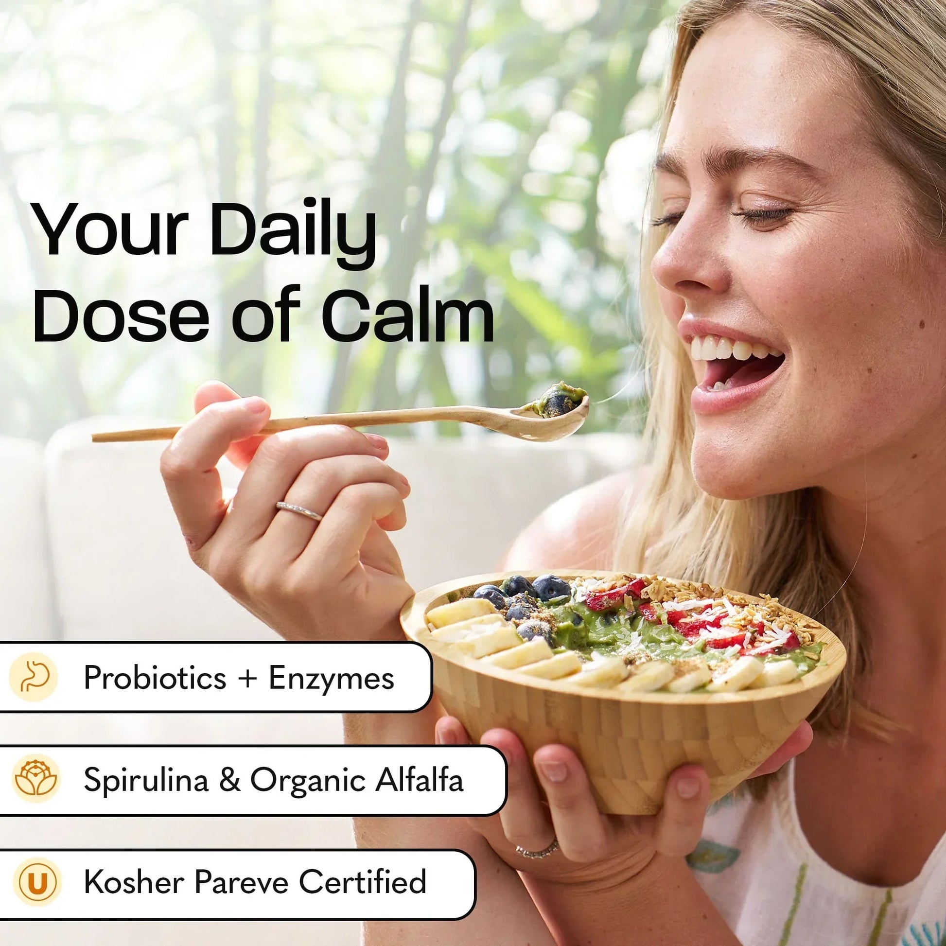 Feel lighter and more balanced from within. Happy Belly blends spirulina, alfalfa, and green tea leaf to nourish your microbiome, reduce bloating, support regul ... Read more